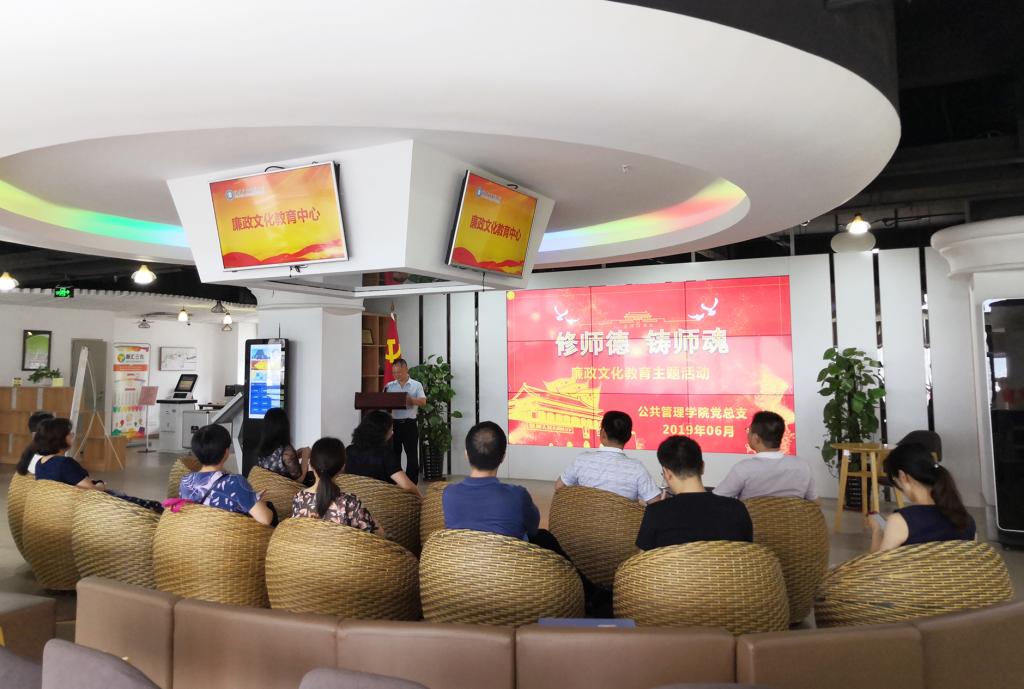 为推进全面从严治党,加强党风廉政建设,增强党支部凝聚力和战斗力,6月11日下午,公共管理学院党总支组织学院全体党员赴廉政文化教育中心开展以“修师德 铸师魂”为主题的党日活动。活动由学校纪委监察科科长蔡亮光主持。
