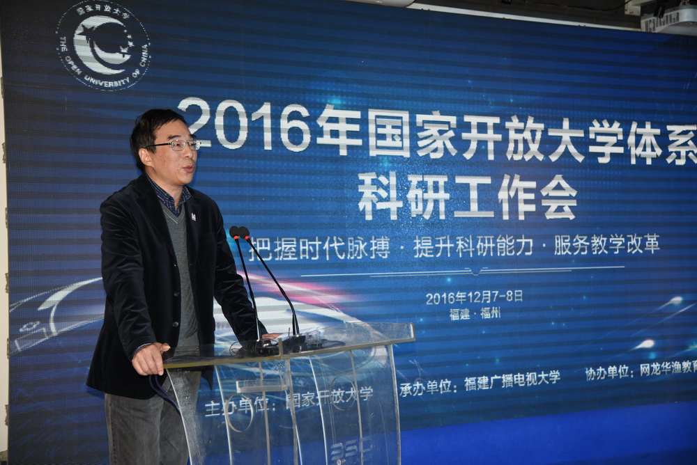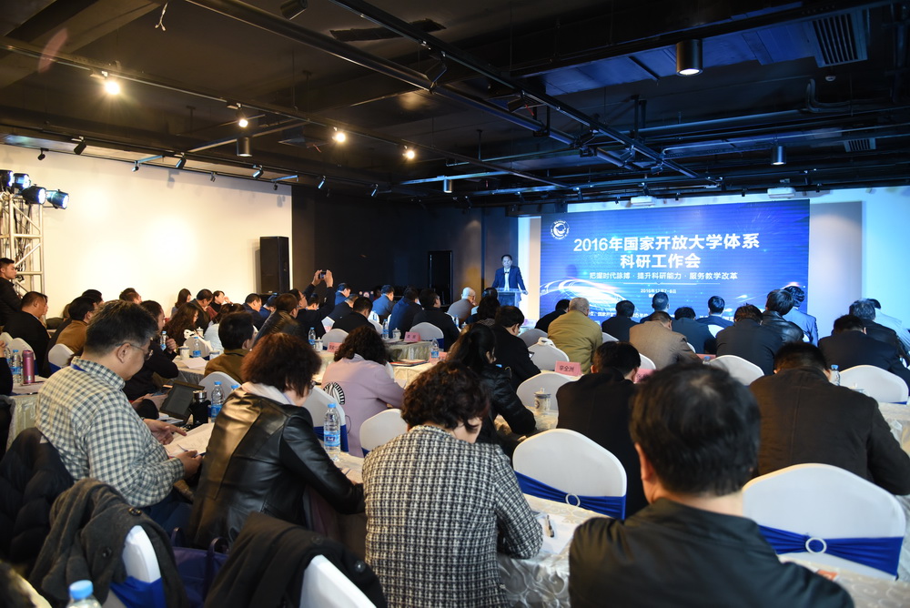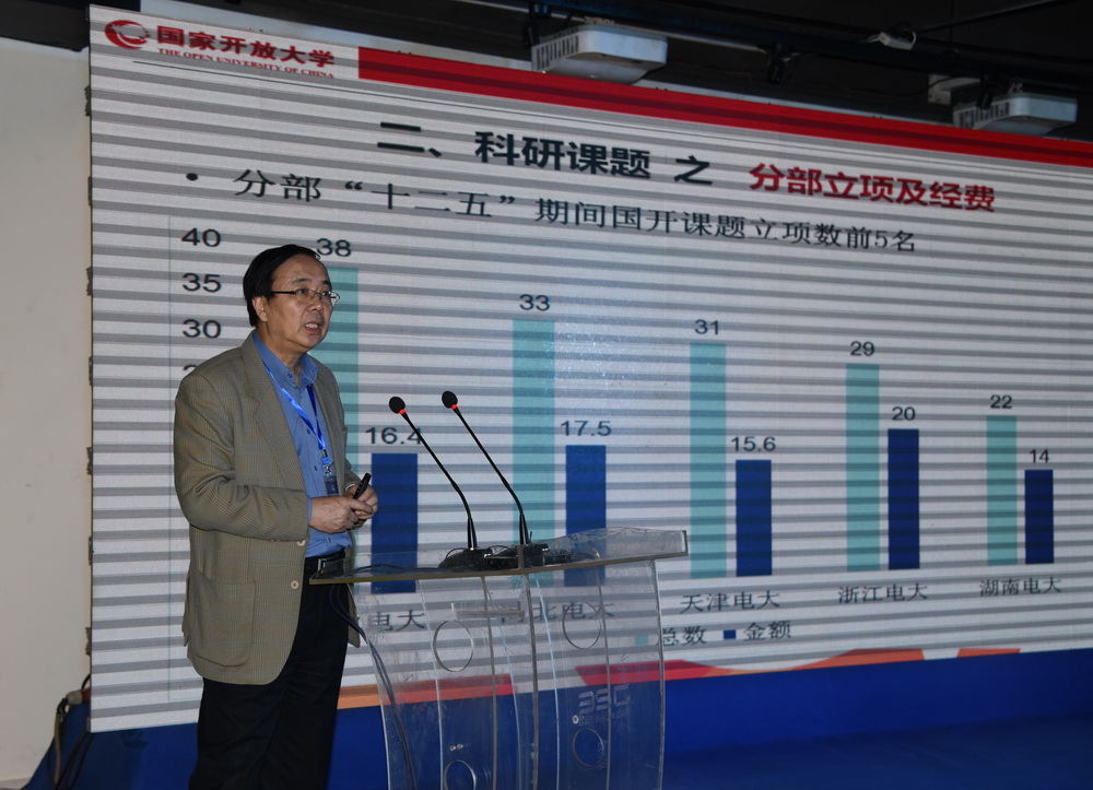杨志坚发表讲话,认为国家开放大学从开放教育试点开始到2012年挂牌成立,以促进全民终身学习为宗旨,秉持“开放、责任、质量、多样化、国际化”办学理念,为社会大众提供高等教育机会,共享优质社会教育资源,促进公平,提升社会满意度和幸福指数,教学改革、体系建设、学分银行等一系列工作得到了有效推进,非学历继续教育取得了长足进步,开放大学及广播电视大学得到政府和主管部门更多的支持,同时也得到世界各国开放大学的关注,社会形象得到进一步提升。目前,改革发展进入了新的历史阶段,远程开放教育宏观环境的变化需要国家开放大学继续凝聚共识、提炼思路、采取措施。他要求,“十三五”期间要以问题为导向,以项目做牵引,明确“能力、实力、水平、质量”的目标,突破性地推进改革,全面推进国家开放大学的改革发展再上新台阶。同时对科研工作提出三点要求:一要围绕主战场开展实践性研究;二要抓大放小,突出重点;三是科研成果要能够为学校及主管部门决策提供方案和建设性意见。