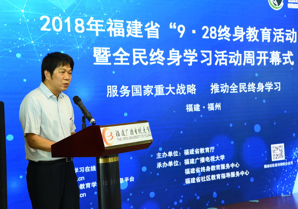 9月28日上午,2018年福建省“9.28终身教育活动日暨全民终身学习活动周”开幕式在我校举行。本次“9.28终身教育活动日”是福建省贯彻落实党的十九大报告关于“办好继续教育,加快建设学习型社会,大力提高国民素质”重要精神的具体举措。活动由省教育厅主办,我校承办。省第十一届政协副主席、省老年大学协会会长,省老年大学校长杨根生,福建广播电视大学校长吴国荣、党委副书记马成斌、副校长陈展虹、纪委书记王幼新,福建老年大学副校长马玉良,省民政厅副巡视员郑成林,省教育厅职业教育与成人教育处处长张文东、调研员刘会勇,福州职业技术学院院长李秋斌及省老龄办、福州市教育局、福州市社区大学、南平市社区大学、鼓楼社区学院、罗源社区学院等领导,福建老年开放(互联网)大学学员、福建省2018年“百姓学习之星“代表等100多人出席开幕式。仪式由副校长沈光辉主持。