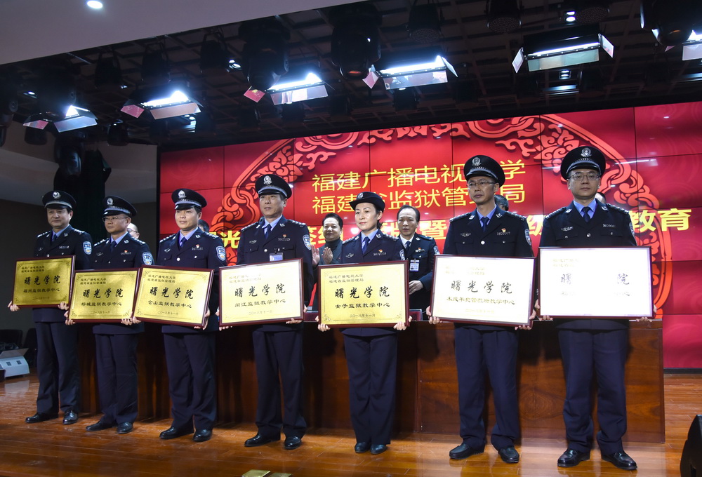 校长吴国荣、闽江监狱监狱长艾贵祥分别代表校方和承办方签署了教学中心合作办学协议书,吴国荣、俞飚分别代表校方和技术支持方签署了教学支持服务协议书,陈兴炎、吴国荣、陈由顺、刘会勇及俞飚共同为曙光学院福州片区七个教学中心授牌并颁发教学中心主任、副主任聘书。