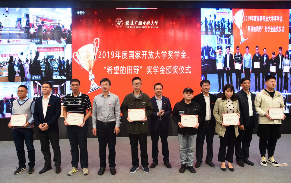 为获得国家开放大学奖学金、“希望的田野”奖学金代表颁发证书