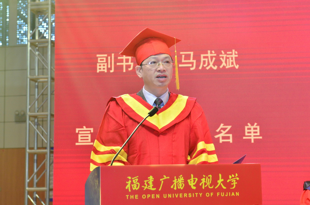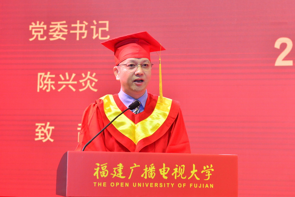 校党委书记陈兴炎致辞。他对同学们顺利完成学业表示祝贺,对同学们踏上新征程提出希望和要求:一要坚守初心,厚植爱国情怀。“国家好,民族好,大家才会好”,希望同学们将小我融入大我,将个人的发展与国家的前途命运联系在一起,主动担当时代责任,努力成为中华民族伟大复兴的追梦人和奋斗者,为全面建设社会主义现代化国家奉献自己的力量。二要坚定信心,做最好的自己。福建电大学子分布在八闽大地的各行各业,有“最美法官”黄志丽、群众脱贫致富带头人陈镇洲、新一代企业领军人物余雄智、新时代农民林慧杰。希望同学们以师兄师姐们为榜样,不妄自菲薄,发挥自己勤奋好学,勇于奋斗,敢拼爱贏的劲头,在奋勇搏击中放飞人生梦想。三要树立恒心,践行终身学习。希望同学们把毕业作为新起点而不是终点,不断学习新知识和新技能,不忘充实自己,提升综合素养,用知识和能力时刻迎接新的挑战,不断实现自我超越。四要珍惜所有,保持感恩之心。今天的中华民族迎来了从站起来、富起来到强起来的伟大飞跃,希望同学们面向未来,常怀感恩之心,感恩伟大的时代,感恩家人的支持,感恩老师的培养,饮水思源,行稳致远。