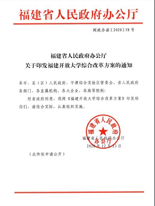 2020年12月23日,福建省人民政府办公厅向各市县(区)人民政府,平潭综合实验区管委会,省人民政府各部门、各直属机构,各大企业,各高等院校印发《福建开放大学综合改革方案》(闽政办函〔2020〕58号),方案提出了综合改革的总体思路、主要任务和保障措施,共三个部分十三条,将对我校的改革和发展起到十分重要的作用。据悉,这是全国第一家以省级人民政府名义印发出台省级开放大学综合改革方案。