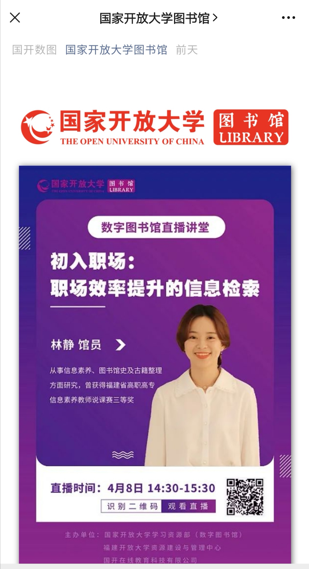 为提升图书馆资源的使用效率,促进我校与国家开放大学教育教学资源共享共建,学校图书馆不断加强与国家开放大学学习资源部(数字图书馆)的资源服务合作。本学期,学校图书馆通过“论道·启思”沙龙平台与国家开放大学图书馆 “数字图书馆直播讲堂” 联合开展系列活动。这是国家开放大学图书馆首次与分部图书馆合作开展直播讲堂活动,也是至今唯一一家分部图书馆与国家开放大学图书馆合作开展系列活动。