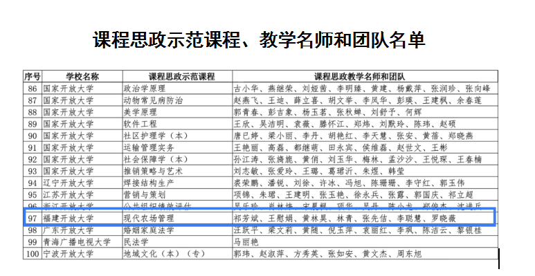 近日,教育部公示了高校课程思政示范项目名单,经组织推荐、专家遴选、会议评议等程序,我校家庭农场经营管理专业的《现代农场管理》课程作为国家开放大学15门入围课程之一入选教育部继续教育类示范课程,以学校理工学院祁芳斌教授领衔的课程教学团队同时入选课程思政教学名师和团队。