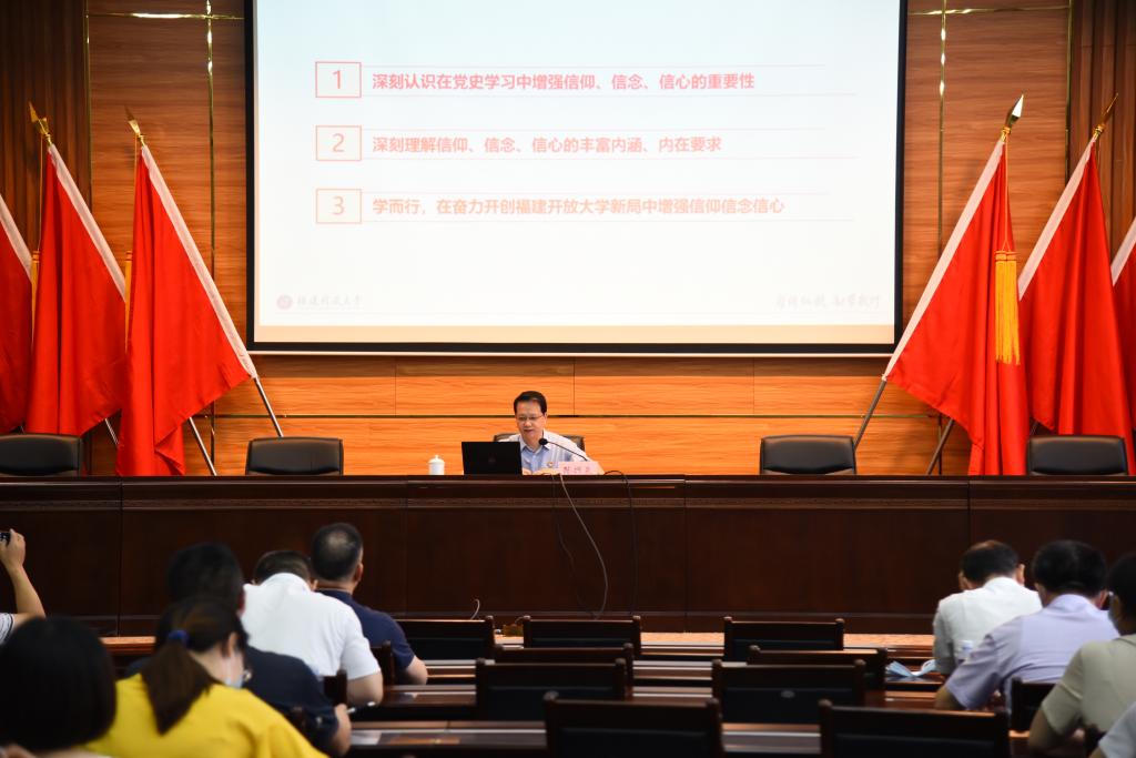 在庆祝中国共产党百年华诞之际,6月30日上午,校党委书记陈兴炎以“学习党史增‘三信’,奋力笃行开新局”为题,为党员干部上“七一”专题党课。机关党总支全体党员聆听党课。