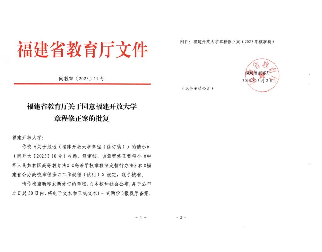 近日,根据《福建省教育厅关于同意福建开放大学章程修正案的批复》(闽教审〔2023〕11号)精神,《福建开放大学章程(修订稿)》经核准后正式发布实施。