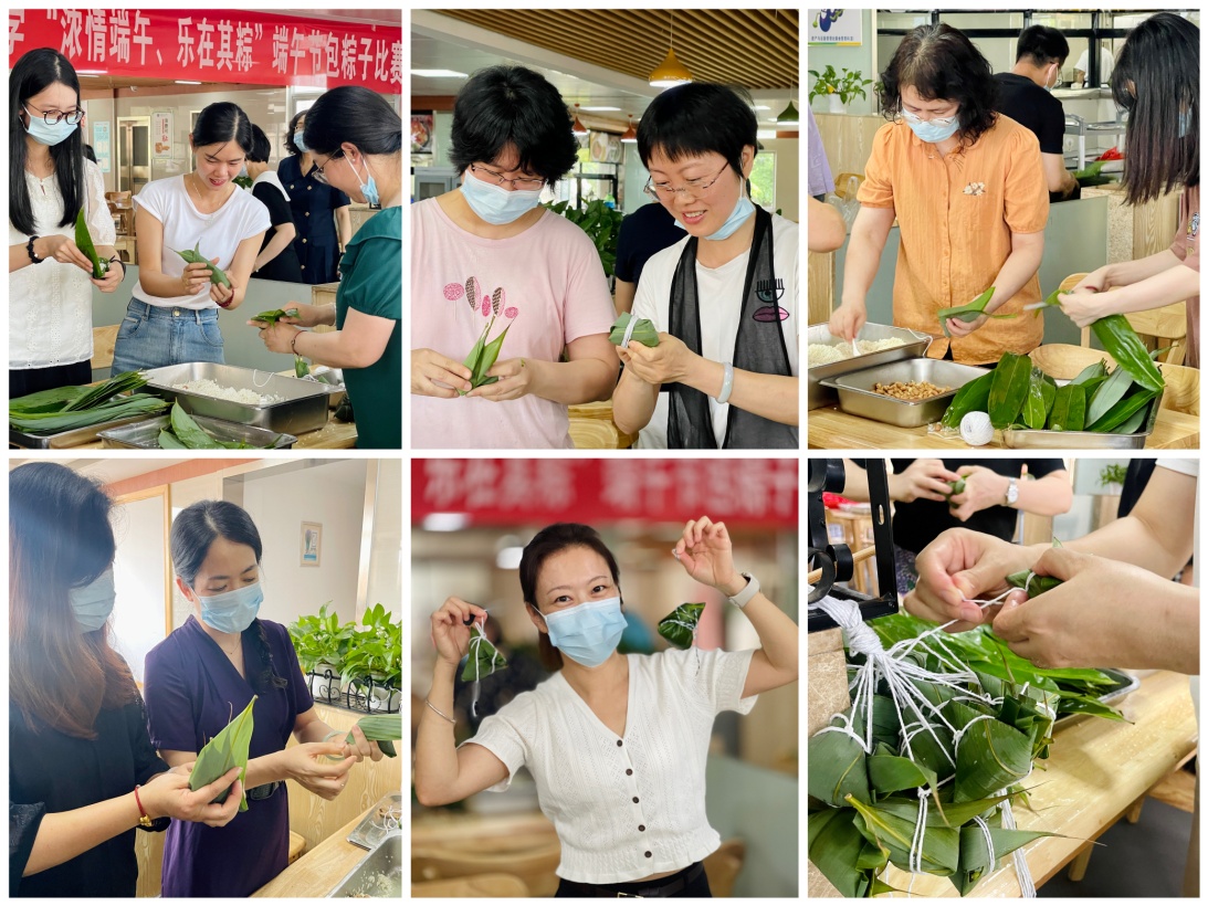 比赛现场欢声笑语,粽香四溢。参赛教职工三人一组,围在桌子前折粽叶、装糯米、系绳子。青翠的粽叶在教职工的手中不停地翻折着,有的教职工技术娴熟,动作一气呵成,糯米和花生经过快、准、巧的包扎,眨眼间,一个个有棱有角的粽子就摆满了桌子;有的教职工初学乍练,边学边包,全力以赴,形态各异的粽子在他们手中逐个诞生。教职工们心灵手巧,将糯米包裹出生活的美好与快乐。