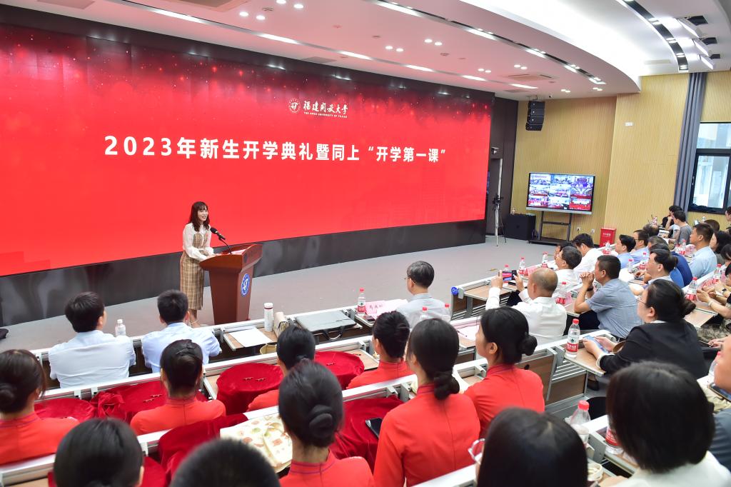 党委书记陈兴炎发表致辞。他首先向参加开学典礼的一万七千多名新生表示热烈欢迎和衷心祝贺,随后介绍了学校的发展历程与转型升级情况。他说,时任福建省省长的习近平总书记向学校二十周年校庆发来贺信和2000年10月到校调研指导工作,这是学校独特的宝贵的精神财富。建校四十四年以来,学校始终坚守“为党育人,为国育才”的初心,依托全省办学体系培养了遍布城乡各行各业的五十多万实用型人才。他例举了黄志丽、郭正光、郑月娥、俞海金、林志军等一批开放教育杰出校友,他们中有全国人大代表、全国优秀教育工作者、优秀科技工作者、省劳动模范、省党代表等,都在各行各业的岗位上,用自己的知识和汗水为福建省经济社会发展作出积极贡献、书写出彩人生。最后,他用“自强弘毅、励学敦行”的校训精神勉励鼓舞新同学们,希望大家在求知求学的路上知不足而奋进、望远山而前行,不断提高知识技能水平、提升就业创业能力、磨练做人做事本领、增强价值信念认同,努力在实现中华民族伟大复兴中国梦的生动实践中成就精彩人生!