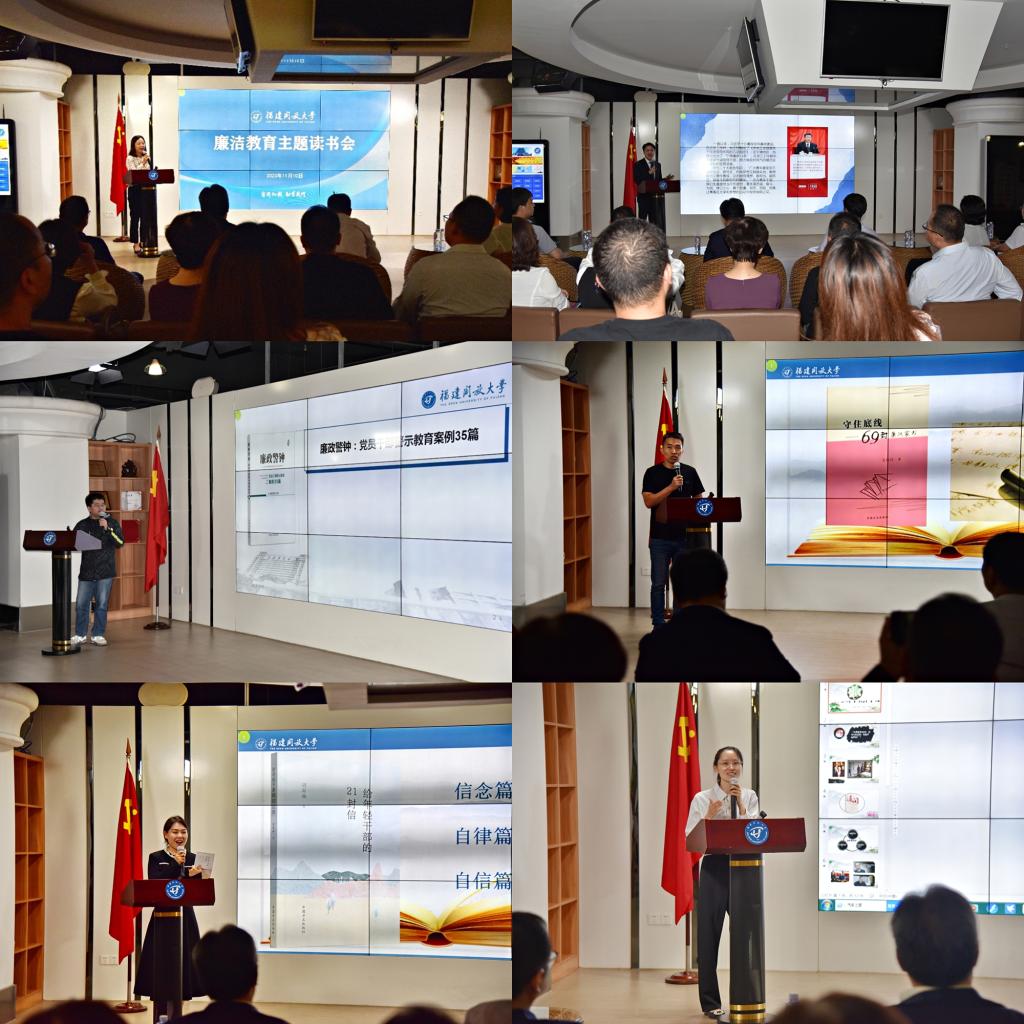 会上,“福小宣”青年宣讲团成员闽江学院师生蒋翔宇、王欣瑞分享了《薪火相传立德树人》廉洁故事,理工学院林澍分享了《廉政警钟:党员干部警示教育案例35篇》学习心得,文经学院刘海波分享读《守住底线——69封廉政家书》有感;远程教育学院沈诗晨分享读《给年轻干部的21封信》有感;职业学院(校团委)林舒俐分享《做一个“青廉”有为的“青廉”干部》。他们结合自己学习体会和工作实际作了精彩的分享交流,主题突出、内容丰富,声情并茂、语言生动。大家表示,将坚定理想信念,守好清正廉洁底线,持续从书籍中汲取精神营养,在推进有特色高质量开放大学建设中提升能力素质、贡献自己力量。