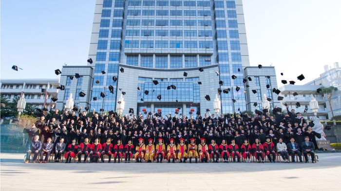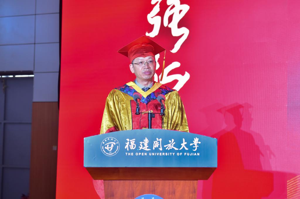 随后,吴国荣致辞。他代表学校向毕业生们表示热烈的祝贺,向辛勤耕耘、默默付出的老师们致以崇高的敬意。他对毕业生深情寄语,提出了四点希望:一要在民族复兴中把准信念之舵,坚定心系家国的人生航向。要以远大志向指引人生方向,向“全国技术能手”俞海金、“最美资助人”林长宣、“全国优秀人民警察”洪树棠、“全国劳动模范”卓明华等优秀校友看齐,在服务国家需要和社会需求中寻找人生真谛和事业方向,追求更有高度、更有境界、更有价值的人生。二要在时代洪流中扎稳立身之本,涵养崇德向善的良好品质。在纷繁复杂的社会中,依然能够坚持良好的道德品质和正确的价值取向,坚守内心的净土和做人的原则,在立德修身中不断走向成熟,始终做一个正直的人、纯粹的人、高尚的人。三要在学无止境中高扬奋进之帆,锻造搏击风浪的过硬本领。提升自我驱动力,争当终身学习的先行者;激发自我创造力,培养符合新时代要求的综合能力,勇做发展潜能的开拓者。四要在知行合一中集聚实干之力,成就逐梦前行的精彩人生。在未来工作生活中,把知行合一作为目标,把坚持不懈作为信条,始终以实干家的态度在成长道路上驱散浮躁功利与现实羁绊,以奋斗者的脚步在实现梦想征途上行稳至远。