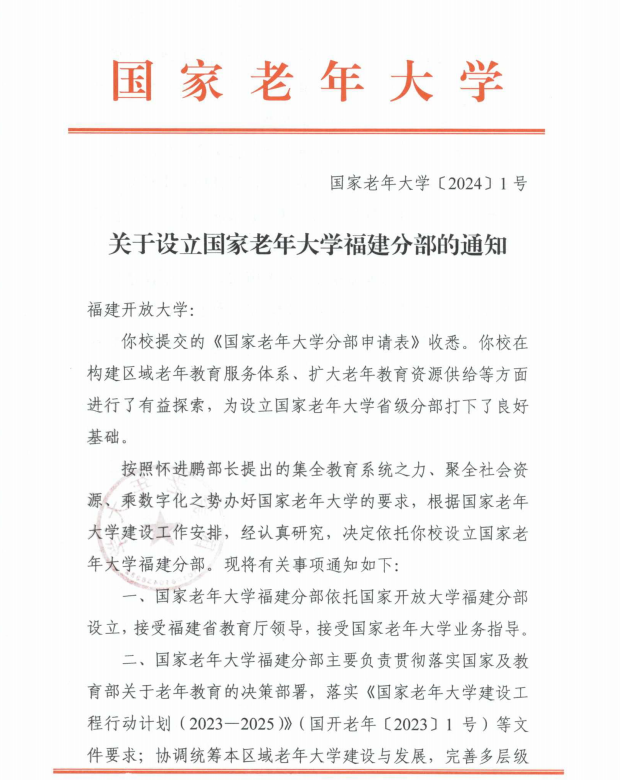 2024年1月8日,国家老年大学下发《关于设立国家老年大学福建分部的通知》,正式批复福建开放大学成立国家老年大学福建分部,具体承担协调统筹本区域老年大学建设与发展、推动老年教育办学服务向城乡社区延伸等相关职责。《通知》肯定了福建开放大学在构建区域老年教育服务体系、扩大老年教育资源供给等方面进行的有益探索与取得的成效,为设立国家老年大学省级分部打下了良好基础,并正式成为国家老年大学体系成员。