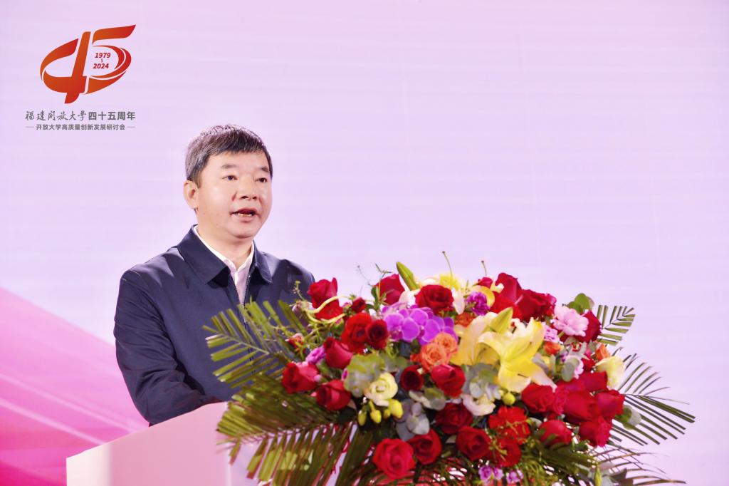 庄莉表示,学校办学45年来,扎根八闽大地、面向“一切学习者”辛勤耕耘,收获了弥足珍贵的思想和实践财富。学校励精图治、砥砺前行,办学网络遍布全省城乡,走出了一条不平凡的传承之路、发展之路。学校扎根基层、服务一线,积极构建学历教育、非学历教育、终身学习支持服务融合发展的办学格局,累计培养了50多万名应用型技能型人才。学校与时俱进、开拓创新,深入推进数字技术与教育教学的深度融合,为促进我省教育公平作出了重要贡献。庄莉表示,新的历史起点上,福建开放大学将锚定育人方向,擦亮“开大底色”,坚持不懈用习近平新时代中国特色社会主义思想铸魂育人;拓展服务面向,提升“开大成色”,以国家老年大学福建分部正式揭牌为契机,积极探索“康养学游”深度融合,促进银发经济高质量发展;强化创新导向,彰显“开大特色”,加强全省办学体系一体化协同发展,推动实现人人皆学、处处能学、时时可学,为谱写中国式现代化福建篇章作出新的更大贡献。