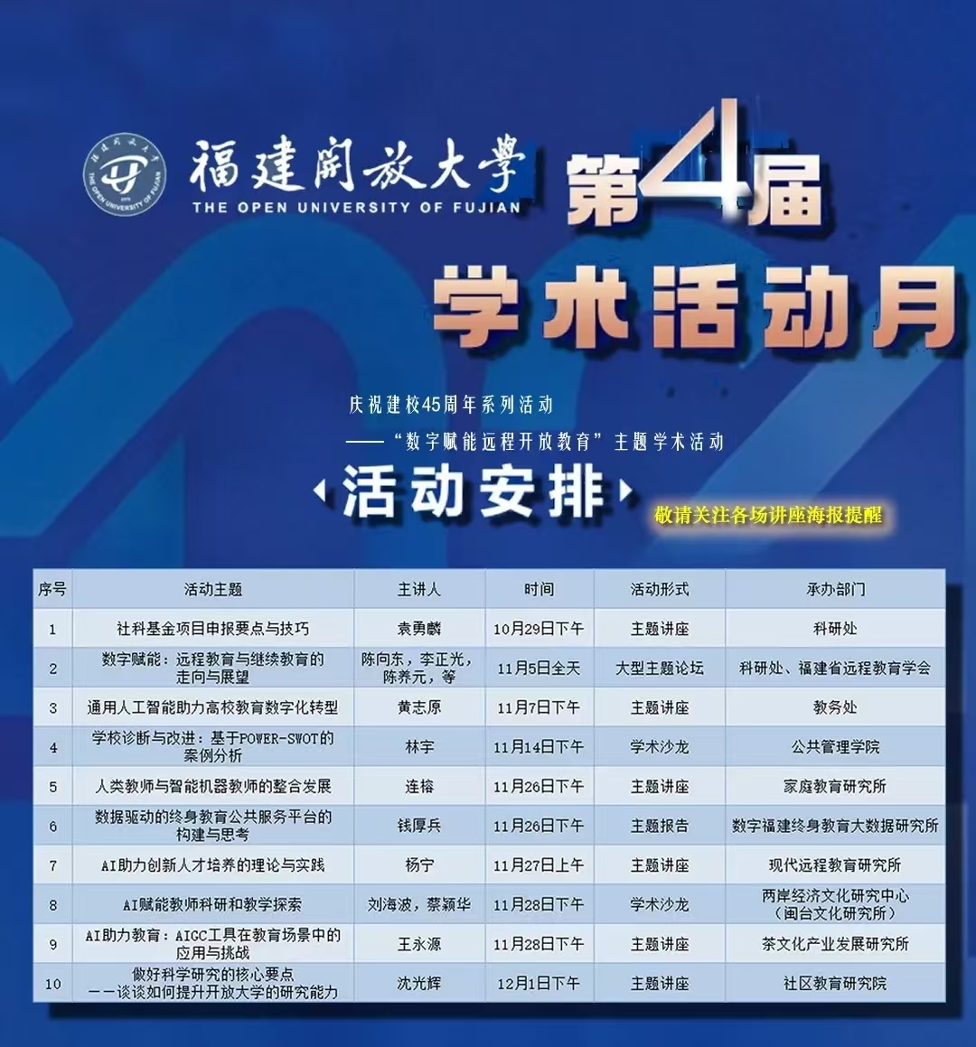 2024年,学校组织遴选21个类别科研项目申报工作,截至目前已获立项省部级项目4项、厅级项目40项;获横向项目4项及合作经费31.05万,取得明显进展。以学校为作者单位发表论文96篇,其中在CSSCI期刊发表论文1篇、北大核心期刊发表论文8篇、CSCD期刊发表论文5篇;5篇理论研究成果在《福建日报》理论周刊刊发,其中求是版刊发党委书记庄莉署名文章《构建泛在可及的终身教育体系》;2篇学术论文在光明网刊发。省校教师所著3本学术专著顺利通过评审获校级学术专著出版补助;数字福建终身教育大数据研究所1本专著入选国家“十四五”重点出版物、国家出版基金资助项目,是近年我校学术专著成果的新突破。原副校长沈光辉入选2024中国知网高被引学者Top1%名单。举办“数字赋能远程开放教育”系列主题学术交流活动。