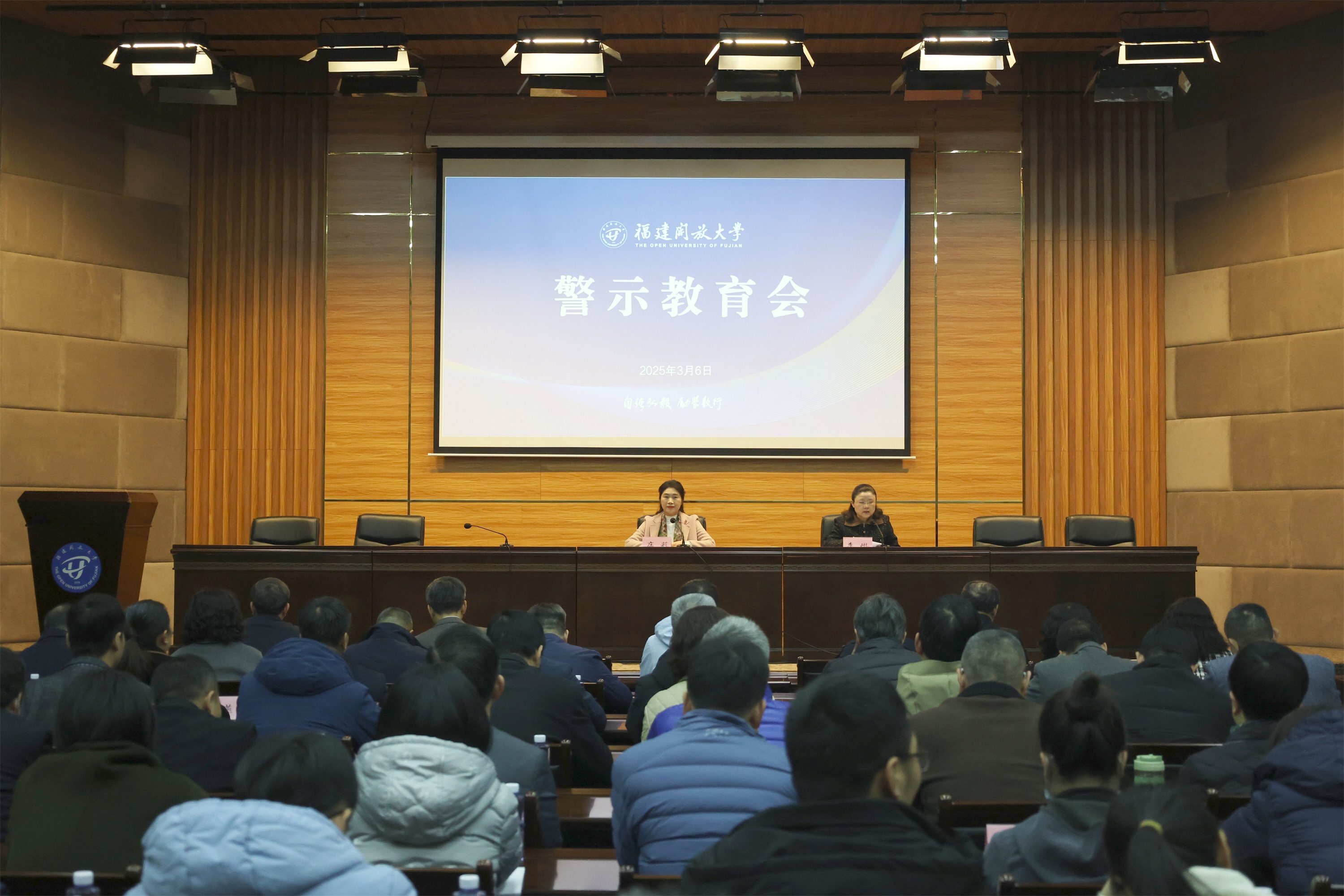 3月6日上午,福建开放大学召开警示教育会。校党委书记庄莉出席会议并讲话,校党委委员、纪委书记、监察专员李琳主持会议。全体校领导、处科级干部及基层党支部书记共130余人参加会议。