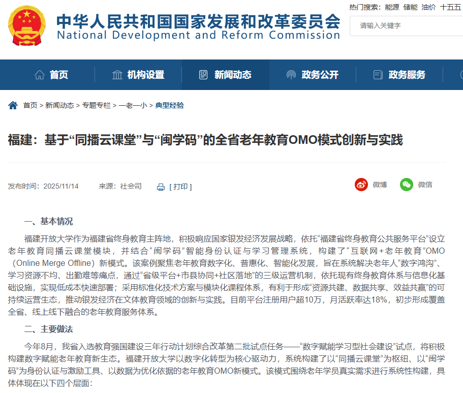 持续推进“学历+技能”的人才培养模式改革,推动数智技术与教育教学深度融合,建成高等学历继续教育智能化教学系统、计算机虚拟实训平台等。教学资源库平台累计汇聚视频资源超1.5万讲,2门课程首次入选国家终身教育智慧教育平台,“i福开”智能助手上线。拓展学分银行应用场景,设立学习成果认证分中心和认证点17个,大力推进“闽学码”推广应用,学习账户总数达66万个。《基于同播云课堂与“闽学码”的全省老年教育OMO模式创新与实践》案例入选国家发改委典型经验。