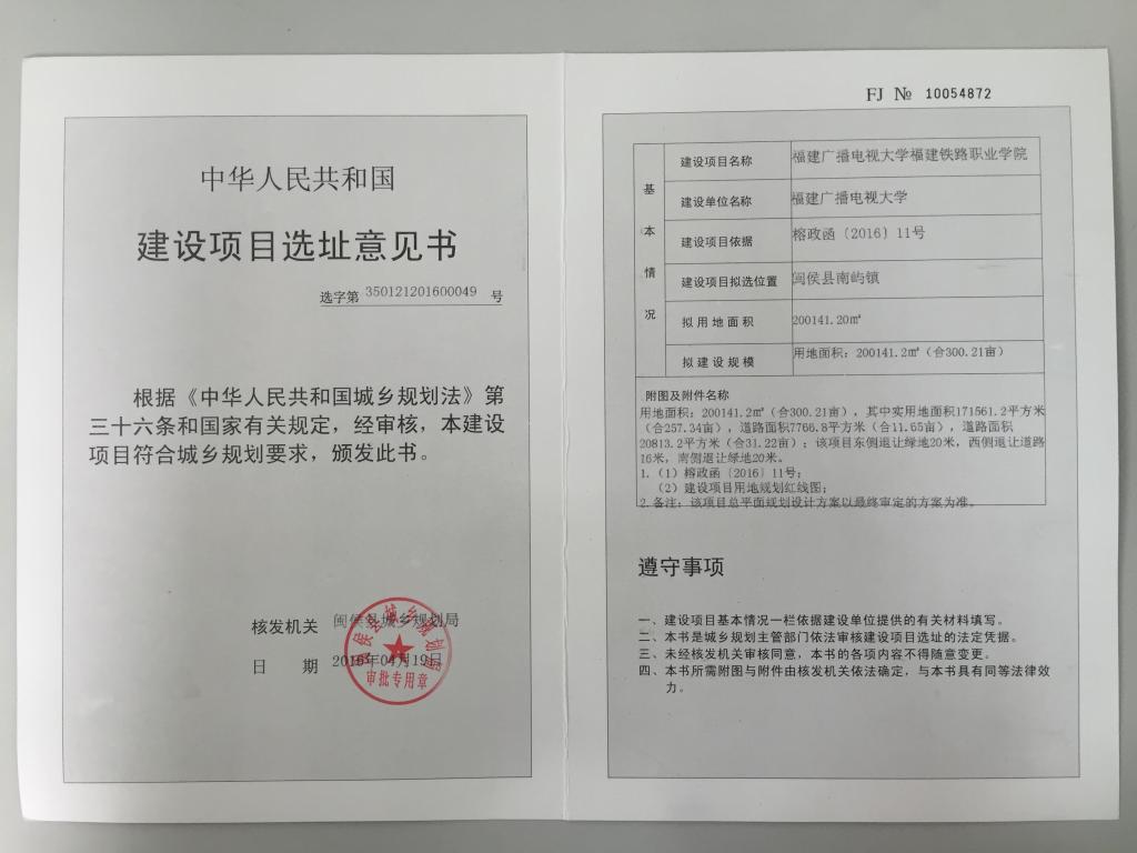 为支持福建电大铁路高职办学,更好地服务我国东南沿海铁路建设需要,在福州市政府、福州高新区及闽侯县政府的大力支持下,学校南屿校区建设用地征用工作取得重大进展。2016年1月13日,福州市人民政府批复了我校新校区建设用地,将福州市高新区南屿片区NYX-1-17地块调整为教育用地,其中300亩作为福建电大办学用地,用于建设铁路职业学院。2016年4月19日,闽侯县城乡规划局核发了福建电大铁路职业学院建设项目选址意见书,核准用地面积300.21亩及建设项目用地规划红线图。