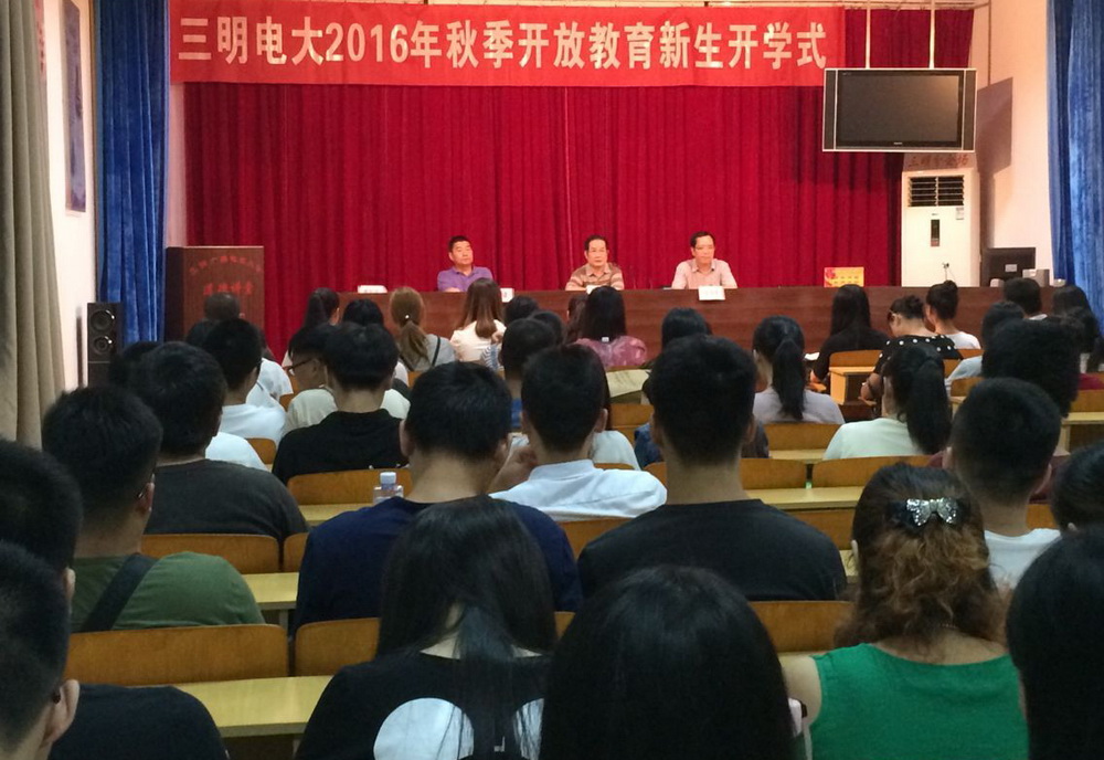 9月25日晚,三明电大举行2016年秋季开放教育新生开学式,校领导、有关处室负责人、开放教育新生各专业班主任以及本、专科新生参加了开学式。副校长周泰谦主持开学式。