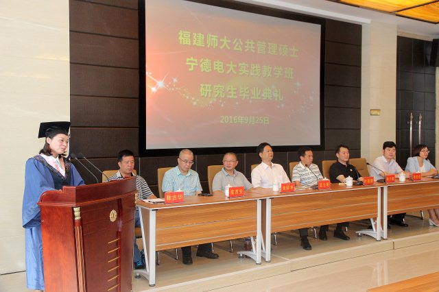 叶祖庚代表宁德电大对全体毕业生表示祝贺。他说,2010年12月宁德电大与福建师范大学合作设立的福建师大公共管理硕士(MPA)专业学位宁德实践教学点,开启了福建省电大系统与闽东研究生教育的新篇章,填补了闽东研究生教育的空白,是全省电大系统首个引进重点高校优质教育资源,与高校合作举办在职研究生教育的学校,这一创举得到宁德市委市政府的重视以及相关部门的支持。6年来,宁德电大积极扩大研究生教育规模,在职硕士研究生培养取得明显成效,目前已正式录取福建师大公共管理硕士96人,已毕业30人,为宁德培养了一批高层次复合型管理专业人才,对“六新大宁德”建设作出应有的贡献。他希望同学们在今后的人生道路和工作岗位上,传承精神,不忘情谊,服务社会,用自己的智慧和才干去铸就未来的辉煌,成为闽东的有用之才。吴立明代表福建师大对毕业生表示祝贺,并希望他们精诚团结,共同发展;明确责任、终身学习;恪守底线、勤恳工作;开放包容、完善自我。