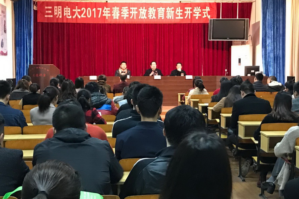 3月26日晚上,三明电大举行2017年春季开放教育新生开学式,校领导、有关处室负责人、开放教育新生各专业班主任以及100多名本、专科新生参加了开学式。副校长周泰谦主持开学式。