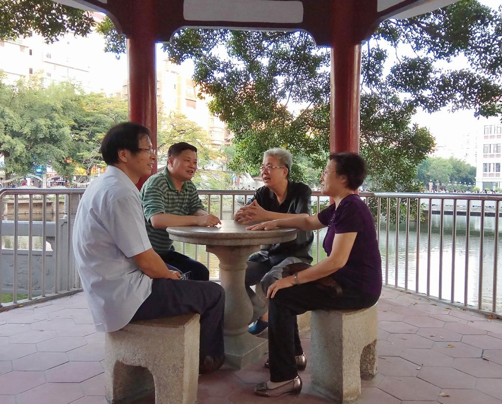 李然向林继中等几位学者介绍了电大校园文化建设的设想和初步成效,希望通过对校园的修缮,能更好地保护丹霞书院旧址,营造师生共同的精神家园。林继中一行在半月池边修葺一新的凉亭座谈。凉亭前的木匾分别题为“丹霞流芳”与“得月逢春”,为中国书法家评审委员会委员、福建省书法家协会副主席李木教书丹,著名篆刻家李叔豪刻制。“丹霞流芳”,意在传承漳州丹霞书院的文脉,弘扬霞漳正学。“得月逢春”取义古代名联“近水楼台先得月,向阳花木早逢春”,当年丹霞书院的半月楼也曾有匾题“近水先得”。