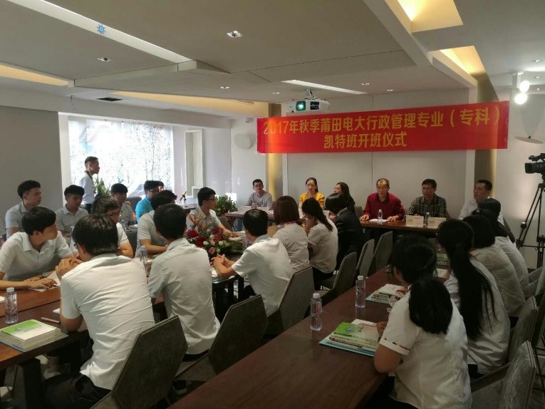 10月27日,2017年秋季莆田电大行政管理专业(专科)凯特班开班仪式在莆田凯特图文服务中心举行。莆田电大郑宗太副校长、相关处室负责人、专业组织员,凯特图文服务中心郭丽卿董事长以及21名新学员参加了开班仪式。这是莆田电大继为2014年秋入学的凯特图文服务中心18名员工顺利提升学历后,为提升该企业员工学历和素质所举办的又一个“订制班”。