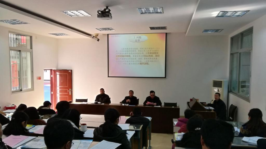 会上,教务处汪志成主任结合上学期巡考过程中发现的问题,强调务必要依法治考,从严治考,要严格按照有关规定和流程,做好期末考试工作;切实加强考前、考中、考后的全过程管理,严把“验证关”和“监考关”,杜绝“代他人考试”现象。