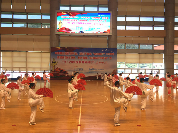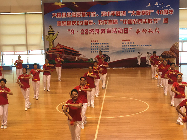 9月28日,大田县庆祝改革开放、邓小平题词“太极拳好”40周年暨2018年“9·28终身教育活动日”、全民终身学习活动周启动仪式在县体育中心篮球馆举行。县政府副县长涂林瑢出席仪式并作讲话。来自12个乡镇和城区的16支代表队、老年大学学员及社会群众共400多人参加。
