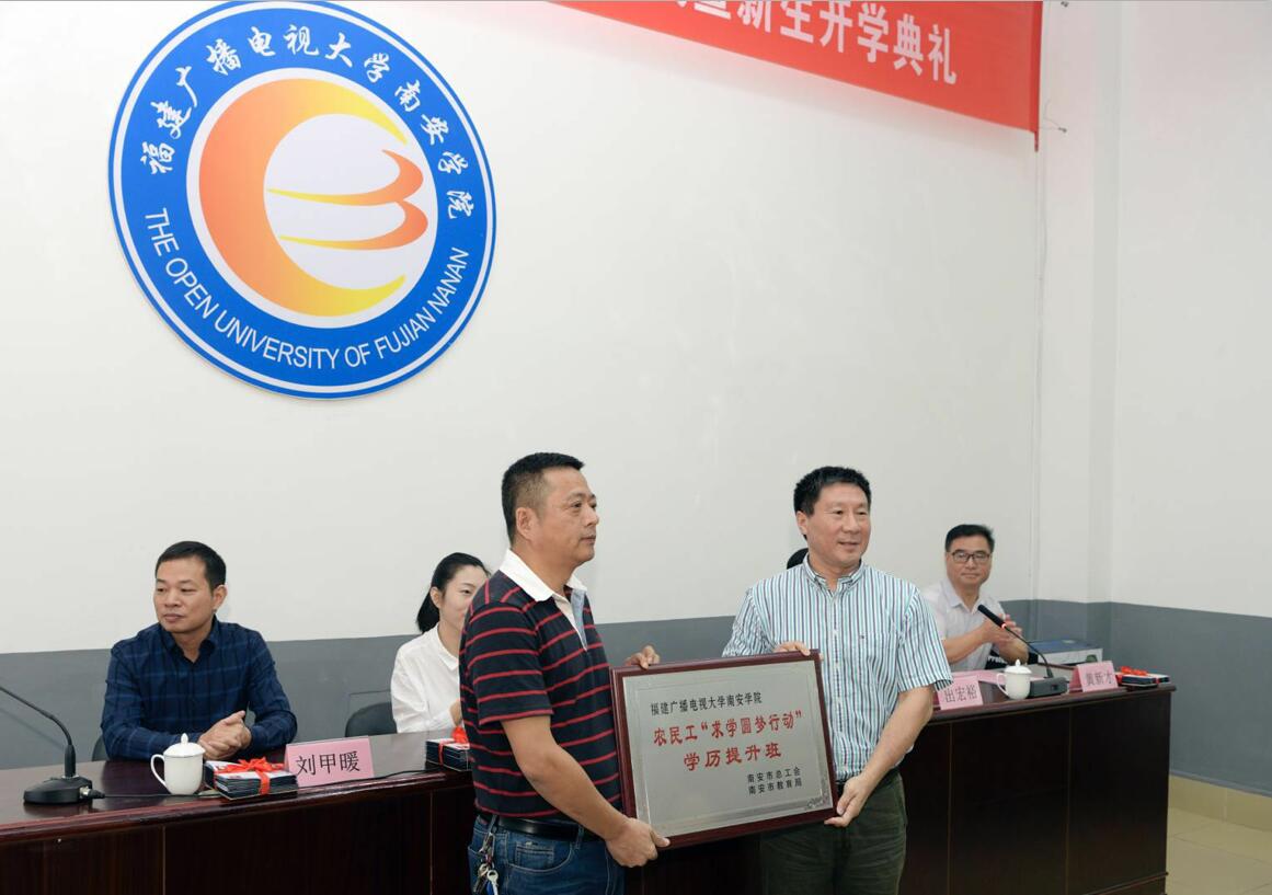 开学典礼上,黄海鹰向电大南安学院授农民工“求学圆梦行动”学历提升班牌匾,南安市总工会副主席刘甲暖,南安市教育局党副局长出宏裕向新生代表陈盼龙、陈永忠授旗。随后,新生黄爱珠代表全体学员作表态发言。