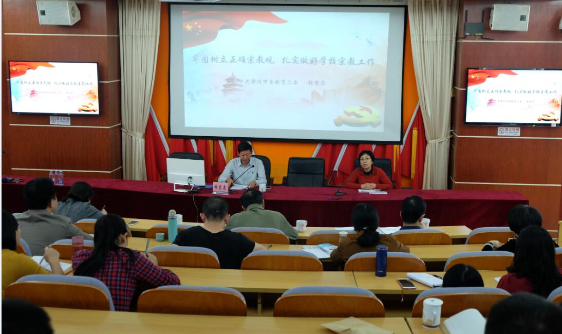 培训期间,市委教育工委副书记林育东以《牢固树立正确宗教观,扎实做好学校宗教工作》为主题,从提高政治站位、增强法制意识、依法依规办事等三个方面对习近平总书记关于宗教的重要论述进行了深入解读;市委讲师团团长黄瑞土以《学习习近平新时代中国特色社会主义思想》为题,详细阐述了习近平新时代中国特色社会主义思想内涵,勉励大家坚定信念、不忘初心、以德立身,做新时代人民满意的教育工作者;我校讲师林海建结合习近平总书记关于全面依法治国的重要论述,为大家做了《民法总则基本常识》的专题辅导。网络学习环节安排全体人员充分利用福建干部网络学院、“党员e家”等学习平台,认真学习习近平新时代中国特色社会主义思想专题,并做好学习交流讨论。