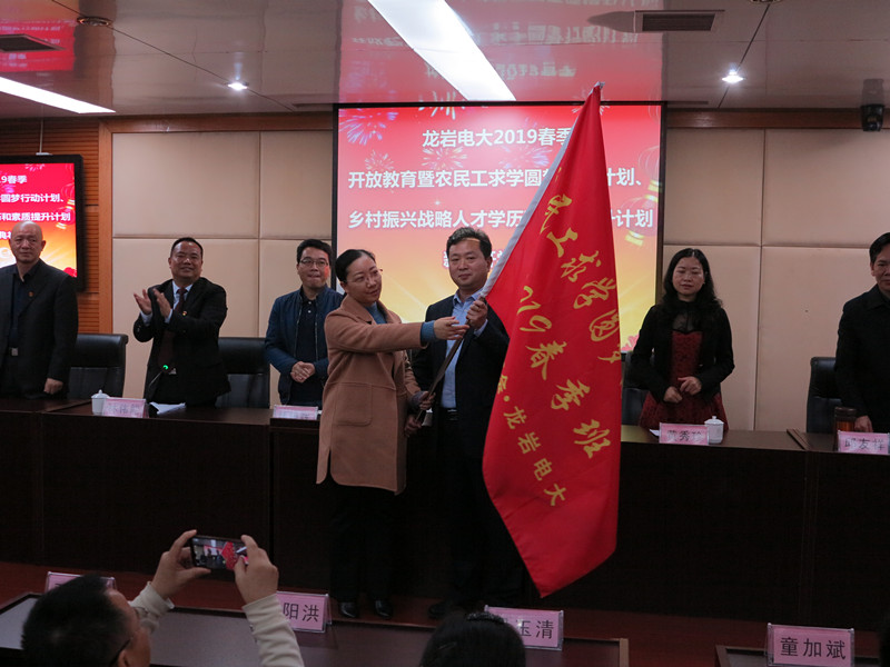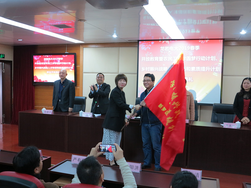 典礼上,廖婷婷、林锦辉分别代表市总工会和区委组织部向“农民工求学圆梦行动计划”和“乡村振兴战略人才学历和素质提升计划”两个班级授班旗。