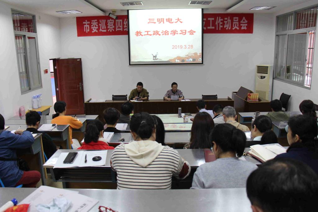 3月28日下午,三明电大举行习近平总书记在学校思想政治理论课教师座谈会上重要讲话精神学习会,校党总支委员、副校长邓小和、周泰谦和全体教工参加了学习会。