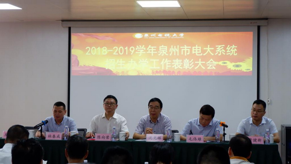 为总结经验,表彰先进,进一步凝聚泉州市电大系统教职员工的精气神,推动泉州市电大系统跨越式发展,7月2日上午,泉州电大隆重举行2018-2019学年泉州市电大系统招生办学工作表彰大会,省电大副校长沈光辉、泉州市教育局调研员毛伟雄出席会议并讲话。泉州分校书记、校长陈向荣,副校长林春成,各处室负责人、各县级电大负责人和受表彰对象参加了会议。