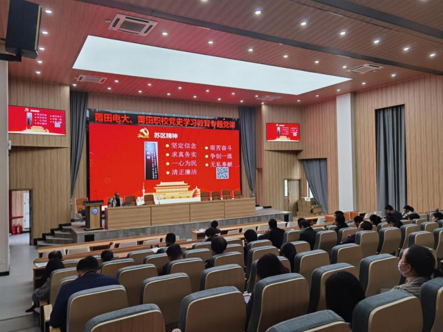 今年是中国共产党建党100周年。为深入学习贯彻习近平总书记在党史学习教育动员大会上的重要讲话精神,推动党史学习教育走深走实,引导全体教职工学习党史悟初心,奋勇争先开新局。3月26日,福建广播电视大学莆田分校开展党史学习教育专题党课,本次党课由校党委书记林荣斌主持,郑宗太副教授进行专题讲授,电大全体教职工及职校全体党员参与了本次专题党课。