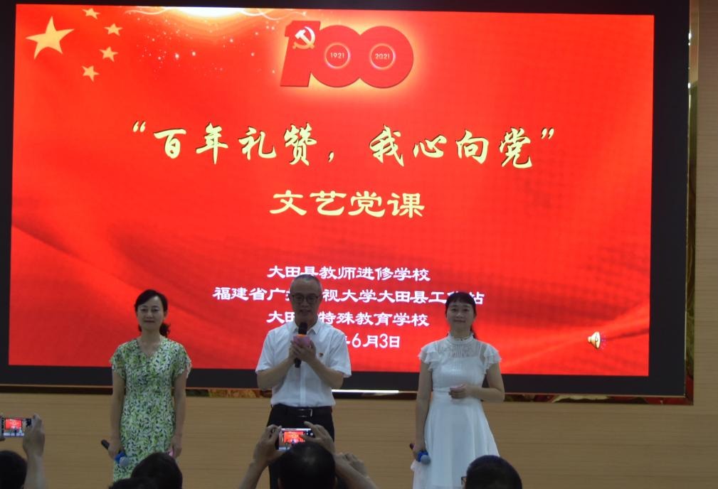 为迎接中国共产党成立100周年,推进党史学习教育深入开展,让广大教职工在党史学习教育中砥砺初心使命,汲取奋进力量,传承红色基因,活跃校园精神文化生活,6月3日下午,大田电大、教师进修学校、特殊教育学校三个单位在一楼报告厅联合举办“百年礼赞,我心向党”文艺党课活动。
