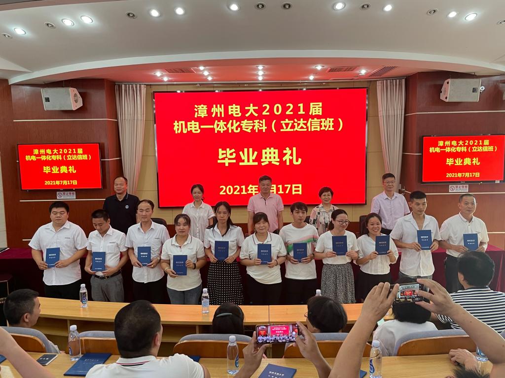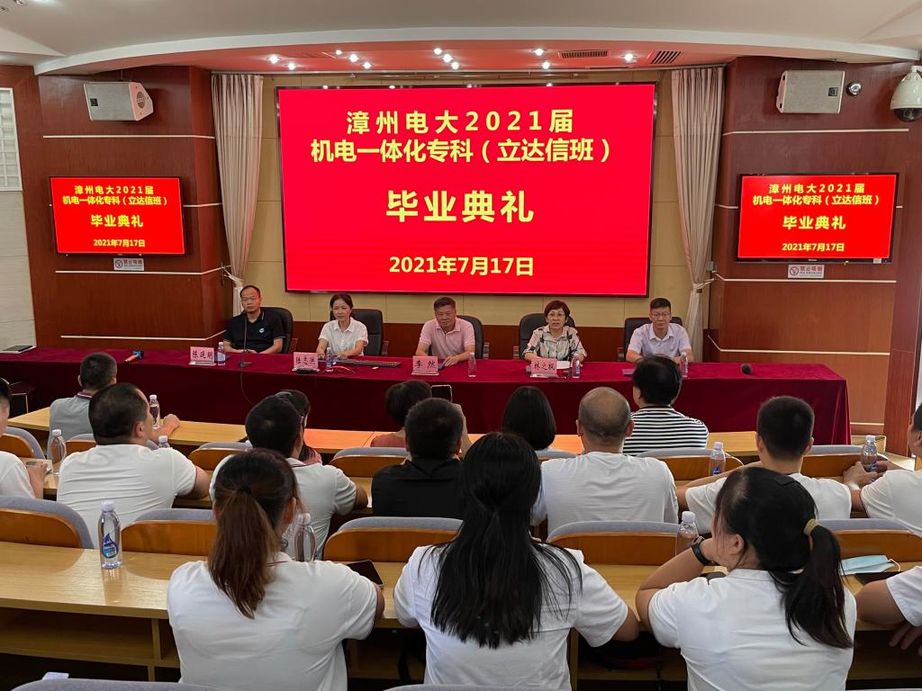 漳州电大与漳州立达信集团校企合作办学喜结硕果!首届机电一体化专科班毕业了。7月17日上午,漳州电大在行知楼会议室举行2021届机电一体化专科(立达信班)毕业典礼。校党委书记、校长李然,副书记林之枫,副校长陆志洪、吕峰鹏,立达信大学制造学院高级经理陈延明,全体毕业生和老师代表一同出席典礼。