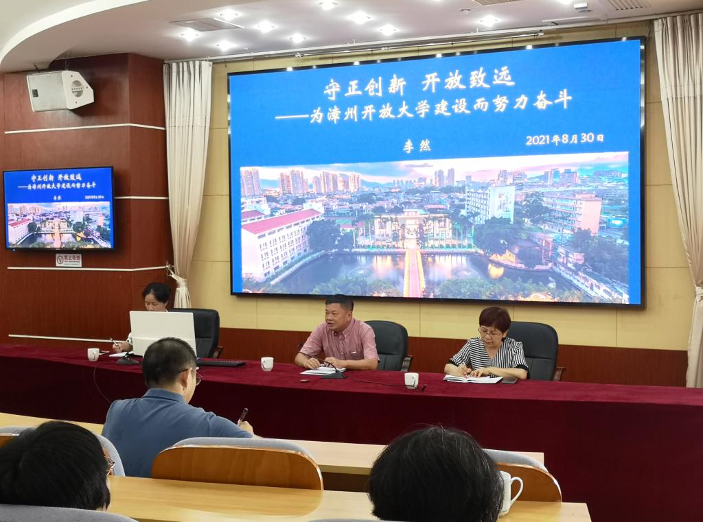 8月30日上午,漳州电大召开2021年秋季新学期全体教职工大会。党委书记、校长李然主持会议,并作题为《守正创新 开放致远——为漳州开放大学建设而努力奋斗》的报告。