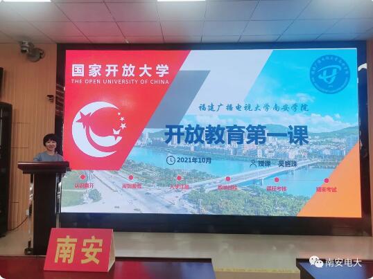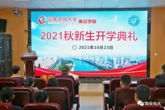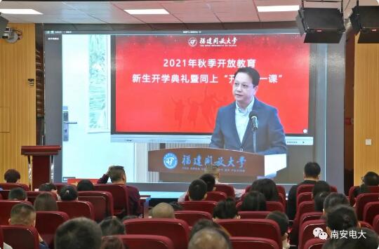 金秋送爽,硕果飘香,又是一年开学时。10月23日上午,福建开放大学、各市县电大新生和老师们共聚“云端”,通过线上线下双向视频,互联互通的方式举行了一场别开生面的开学典礼。福建开放大学“2021年秋季开放教育新生开学典礼暨同上开学第一课”主会场设在省开大桂山校区智慧教室,各市县电大、教学点设立分会场。电大南安学院陈宗辉院长带领全院教职员工及2021年秋季110多名新生代表在南安学院智慧教室同步参加,其余近千名新生也通过扫二维码全程参与了活动。电大南安学院分会场由尤春生书记主持。