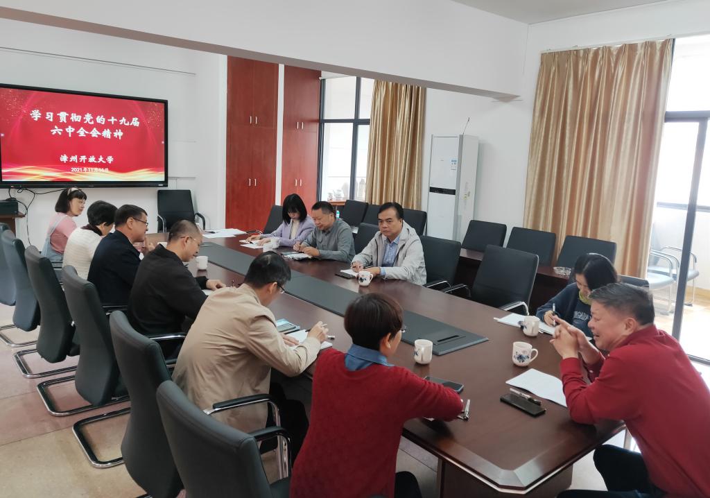 会议强调,各基层党组织要把学习、宣传、贯彻好党的十九届六中全会精神作为当前和今后一个时期重要的政治任务,精心组织、周密安排,切实把干部师生的思想行动统一到全会精神上来,更加紧密地团结在以习近平同志为核心的党中央周围,深入学习贯彻习近平新时代中国特色社会主义思想,大力弘扬伟大建党精神,为实现第二个百年奋斗目标、实现中华民族伟大复兴的中国梦而不懈奋斗。党员领导干部要学在前、做在前,全面系统学习领会全会精神的丰富内涵与核心要义,牢牢把握正确方向导向,推动党史学习教育深化拓展,引导广大师生增强历史自觉、意气风发走向未来,不忘初心、牢记嘱托,以更名转型为契机,建设有特色高质量的漳州开放大学,为建设漳州现代化滨海城市作出应有贡献。