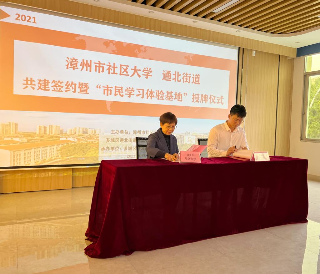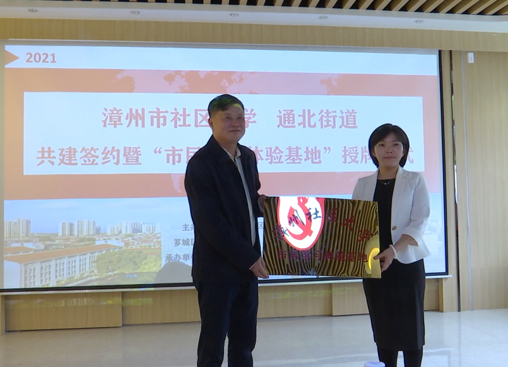 为深入贯彻落实党的十九大和十九届四中、五中、六中全会精神, 按照“构建服务全民终身学习的教育体系”要求,不断深化学习型社会建设,漳州市社区大学在漳州市通北街道挂牌成立漳州市社区大学“市民学习体验基地”,并签署了共建协议,未来将在党建、社区教育、老年教育等方面开展结对共建活动。漳州开放大学党委书记、校长李然,芗城区委副书记洪维椿,漳州开放大学党委副书记林之枫,通北街道党工委书记洪旻禛,通北街道办事处相关领导及漳州开放大学相关科室负责人参加活动。