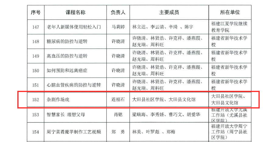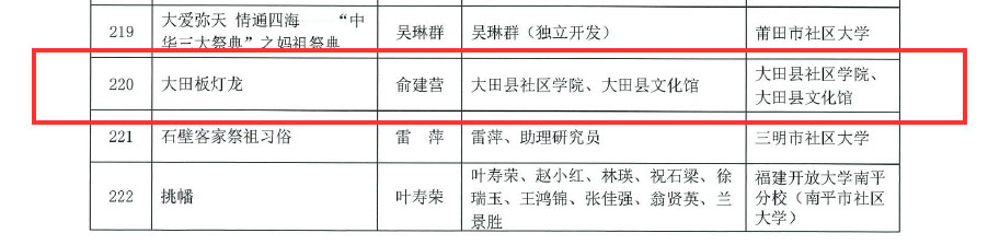日前,福建省终身教育促进委员会公布2019-2020年度省级终身教育研究课题结题项目和继续教育网络课程验收通过名单,大田县社区学院(电大)、县文化馆联合拍摄制作的继续教育网络课程《大田板灯龙》、《杂剧作场戏》两门课程上榜。