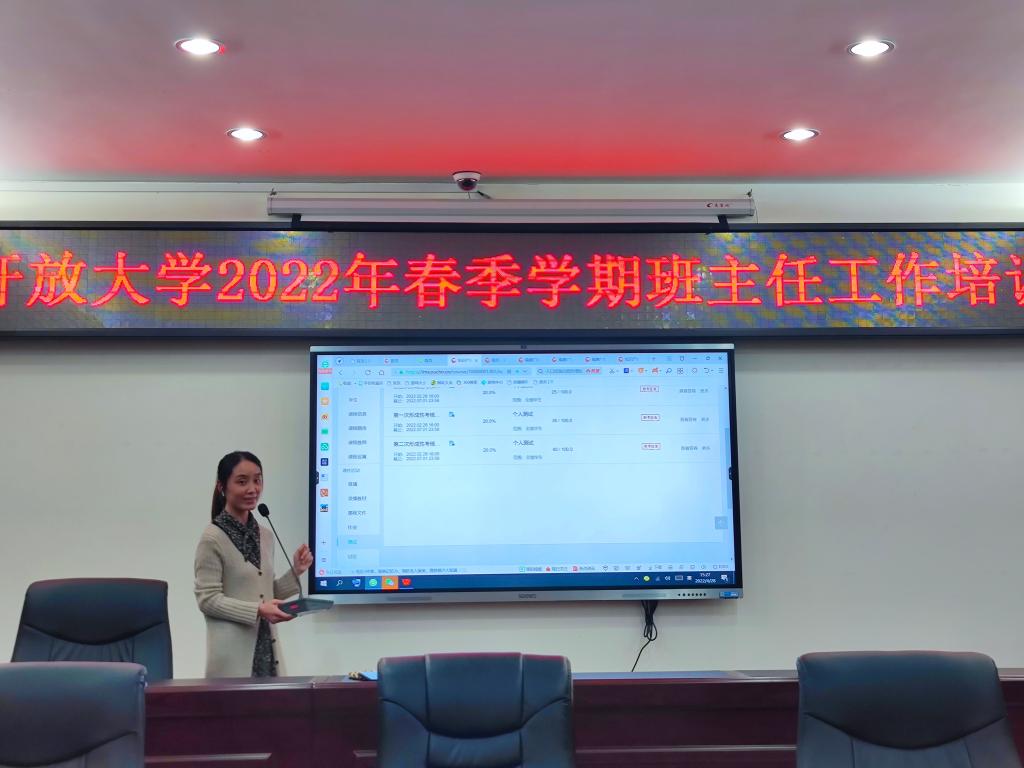 培训会上,唐文奕为班主任们介绍国家开放大学全新的综合管理服务平台——“一网一平台”,并从班主任角色、教学管理以及学生角色等方面详细讲解操作流程,让班主任系统了解新平台的使用,从而提升班主任业务水平,更好地为学生提供学习指导。
