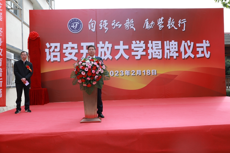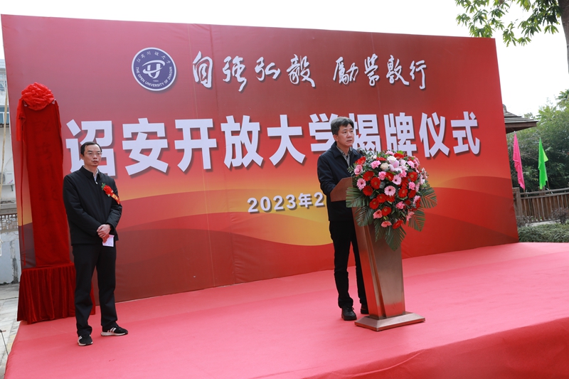 蓝志远代表诏安县委、县政府致辞。他指出,福建广播电视大学诏安县工作站成立于1984年,经过一代代诏安电大人的辛勤耕耘,办学条件不断完善,办学形式灵活多样,办学规模稳定发展,先后开设本、专科专业几十个,培养毕业生七千多名,为诏安县高等教育大众化、普及化做出了重要贡献。他表示,福建广播电视大学诏安县工作站更名为诏安开放大学,既是对诏安电大多年来发展成果的肯定,也是对推进诏安县终身教育体系建设的鞭策和激励。他希望,诏安开放大学在省市开大的指导下,立足新起点,勇担新使命,抢抓新机遇,依托“两级统筹、四级办学”体制,深化办学模式改革,以规范促发展,以服务树品牌,走出一条成人教育特色道路,做到出亮点、见实效、创佳绩。