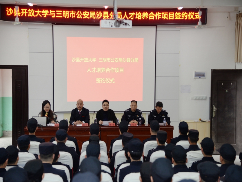 3月3日下午,沙县开放大学与三明市公安局沙县分局举行人才培养合作项目举行签约仪式。沙县区副区长、公安分局长党委书记、局长郑立新,党委委员、政工室主任詹德状,沙县开放大学校长蔡志刚,副校长班玉凌,福建开放大学招生与体系建设办公室项目开发科科长游桂及第四期辅警轮训共80多名辅警参加了签约仪式。签约仪式由班玉凌主持。