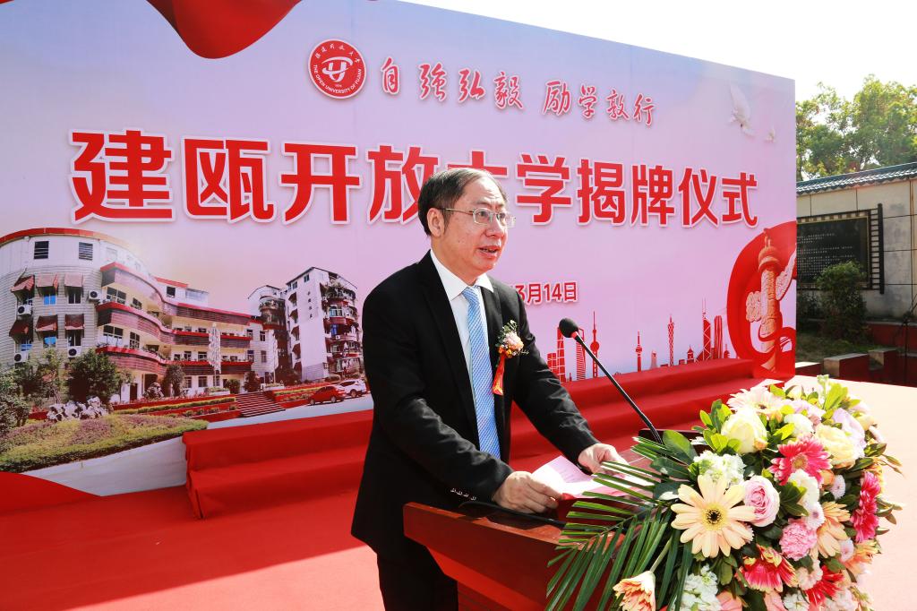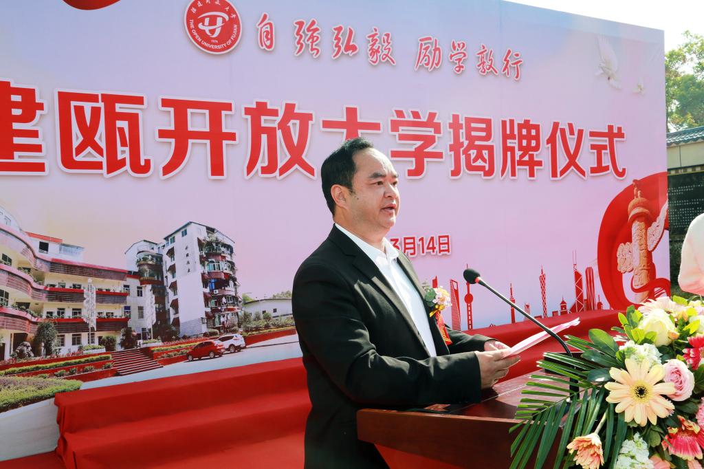 在全国上下学习贯彻2023年两会精神和全省深入实施“深学争优、敢为争先、实干争效”行动之际,3月14日上午,建瓯开放大学揭牌仪式在校园内举行。福建开放大学党委委员、副校长吴建铭,南平开放大学校长林忠炎,建瓯市人民政府市长吴伟,建瓯市委常委、宣传部部长叶华,建瓯市人大常委会副主任陈秀机,建瓯市人民政府副市长张年雄,建瓯市政协副主席雷佩兰,福建开放大学学生工作处、保卫处副处长黄生春,各兄弟县(市、区)开放大学负责人及市教育局领导班子成员等出席仪式,揭牌仪式由建瓯市教育局局长何华生主持。