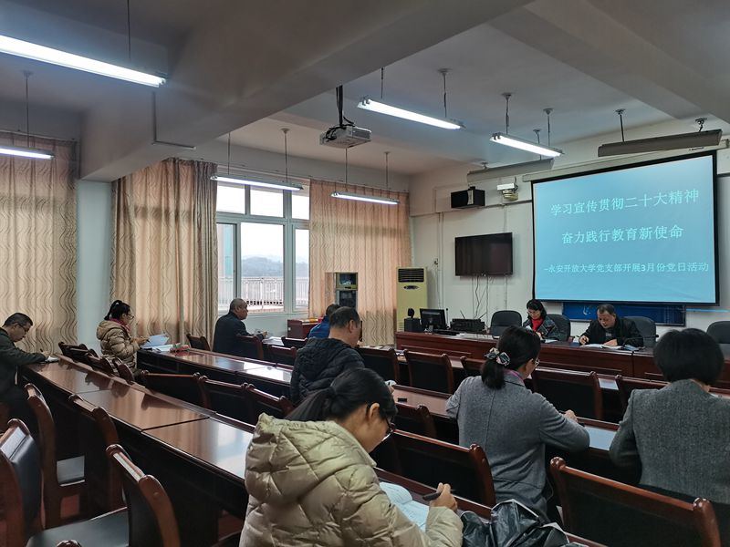 3月28日下午,永安开放大学党支部在三楼会议室开展题为“学习宣传贯彻党的二十大精神 奋力践行教育新使命”的党日活动,本次党日活动由党支部书记李维寿主持。
