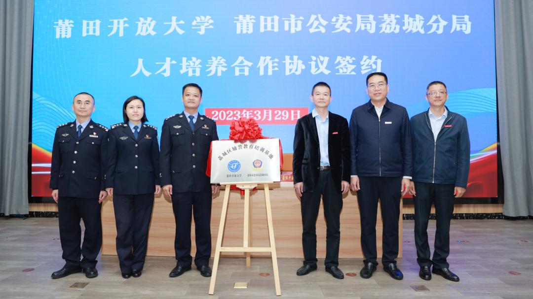 为贯彻落实习近平总书记关于“产教融合、工学一体、跨界融智、学培融通”的要求,发挥学校学历教育和非学历教育的双重资源优势,全面助力荔城区提升辅警队伍的学历和综合素质,3月29日下午,莆田开放大学与荔城区公安分局在莆田开放大学举行人才培养合作框架协议签约暨荔城区辅警教育培训基地揭牌仪式。