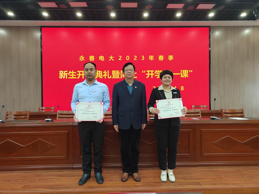 开学典礼上,李锦江为2021年度“国家开放大学优秀毕业生”获得者林志军,2021年度国家开放大学奖学金获得者刘伟政、王巧玲,2022年度福建开放大学“优秀毕业生”获得者吴应栋、郭素玉,2022年福建开放大学“喜迎二十大 强国由我”大学生网络文化作品二等奖获得者林志军、三等奖获得者吴应栋,2022年福建开放大学中华经典诵写讲大赛“笔墨中国”汉字书写比赛一等奖获得者黄更生、二等奖获得者康贵土颁发荣誉证书。