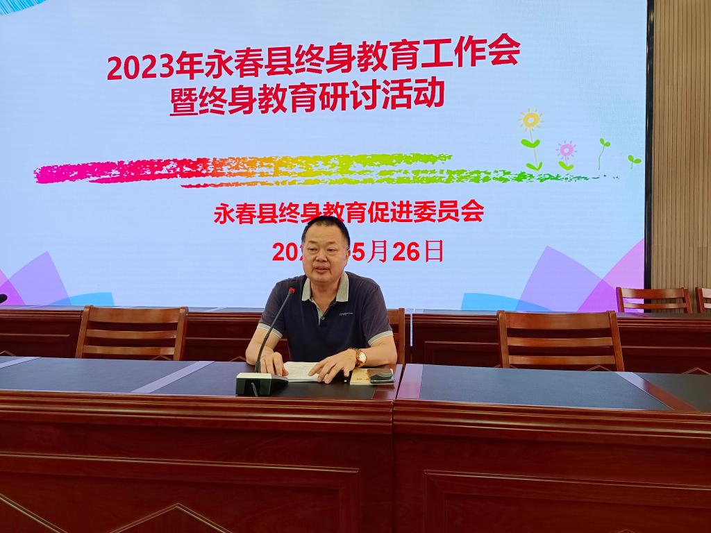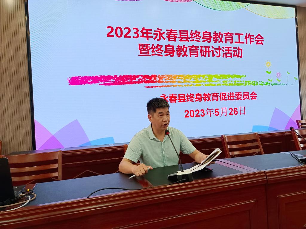 余文湖、颜清地、吴成林、颜幼妹等四位同志分别作《注重社区教育 厚植爱国情怀》《数学教学为全民终身学习提速》《从数学的视角看农村终身教育》《浅谈语文教学在终身教育中的作用》终身教育工作专题研讨发言。永春县教育局基础教育股(成教)负责人黄万选对四位同志精彩的终身教育专题研讨发言给予充分肯定,并就如何做好该县2023年终身教育工作进行详细的部署。