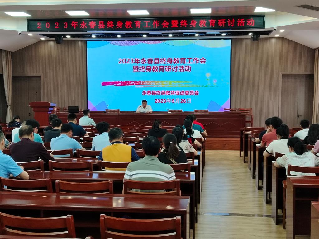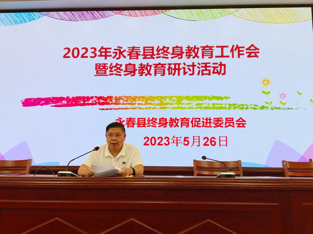 5月26日上午,永春县在县教育中心六楼会议室召开全县终身教育工作会暨终身教育研讨活动,永春县教育局、老教委、老年大学、各乡(镇)终身教育协调工作领导小组相关人员以及县教师进修学校相关负责人共55人参加。永春县教育局副局长黄茂华出席并讲话。